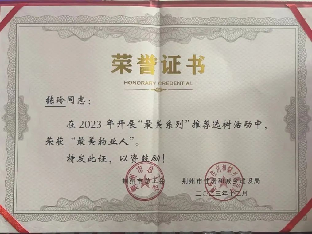 同時(shí),在2023年的“最美系列”推薦選樹活動中,荊州市評選出了10位物業(yè)人員獲得“最美物業(yè)人”榮譽(yù)稱號。湖北福晟物業(yè)有限公司高級主管張玲玲由于在黨建引領(lǐng)的紅色物業(yè)服務(wù)企業(yè)中取得了出色成績,成為監(jiān)利市首位獲得“最美物業(yè)人”個(gè)人榮譽(yù)稱號的優(yōu)秀人才。